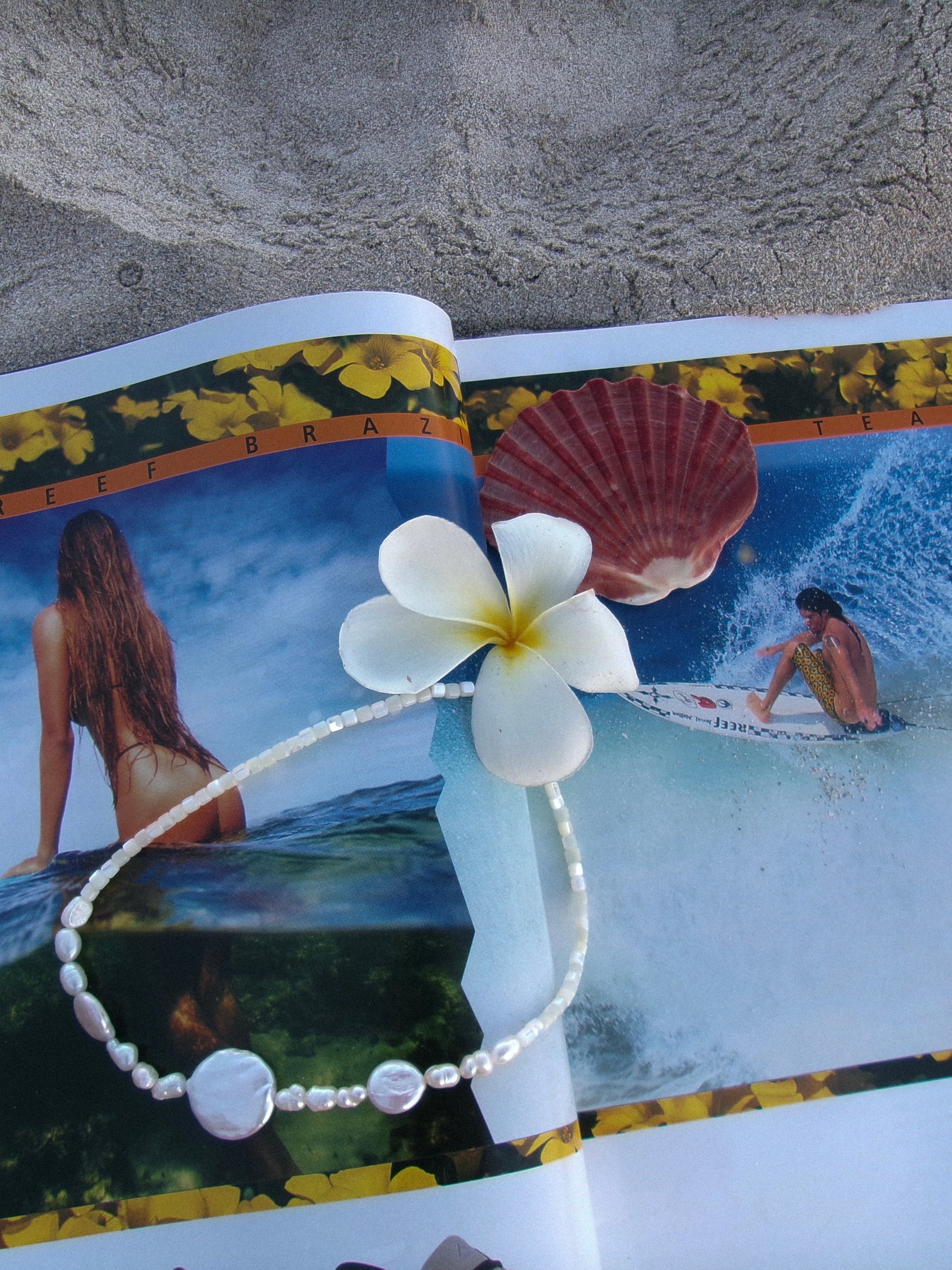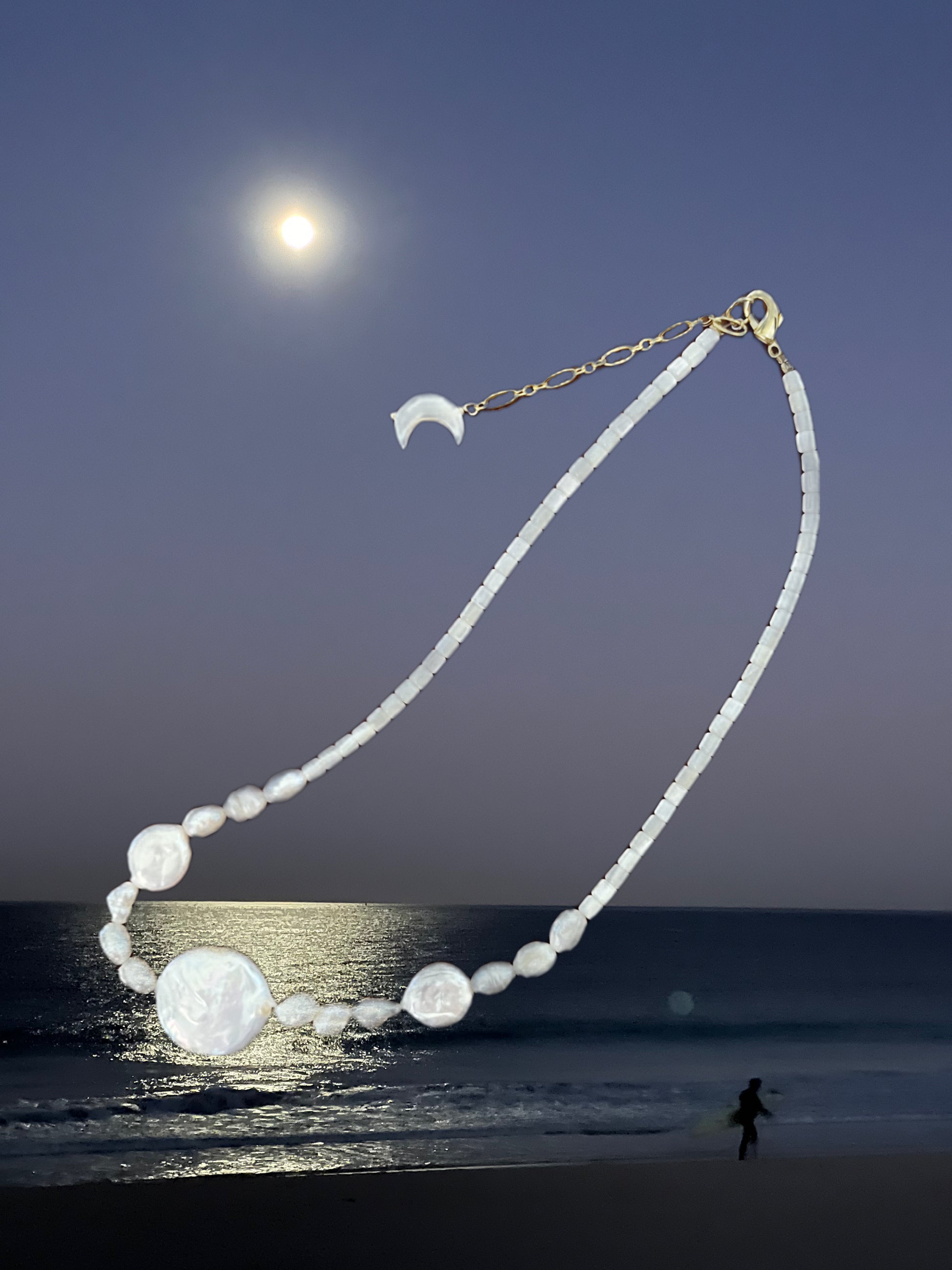 The Moonlight Choker features Trochus shell beads strung with a varying range of freshwater irregular pearls and coin pearls at the centre, creating a stunning gradient effect.